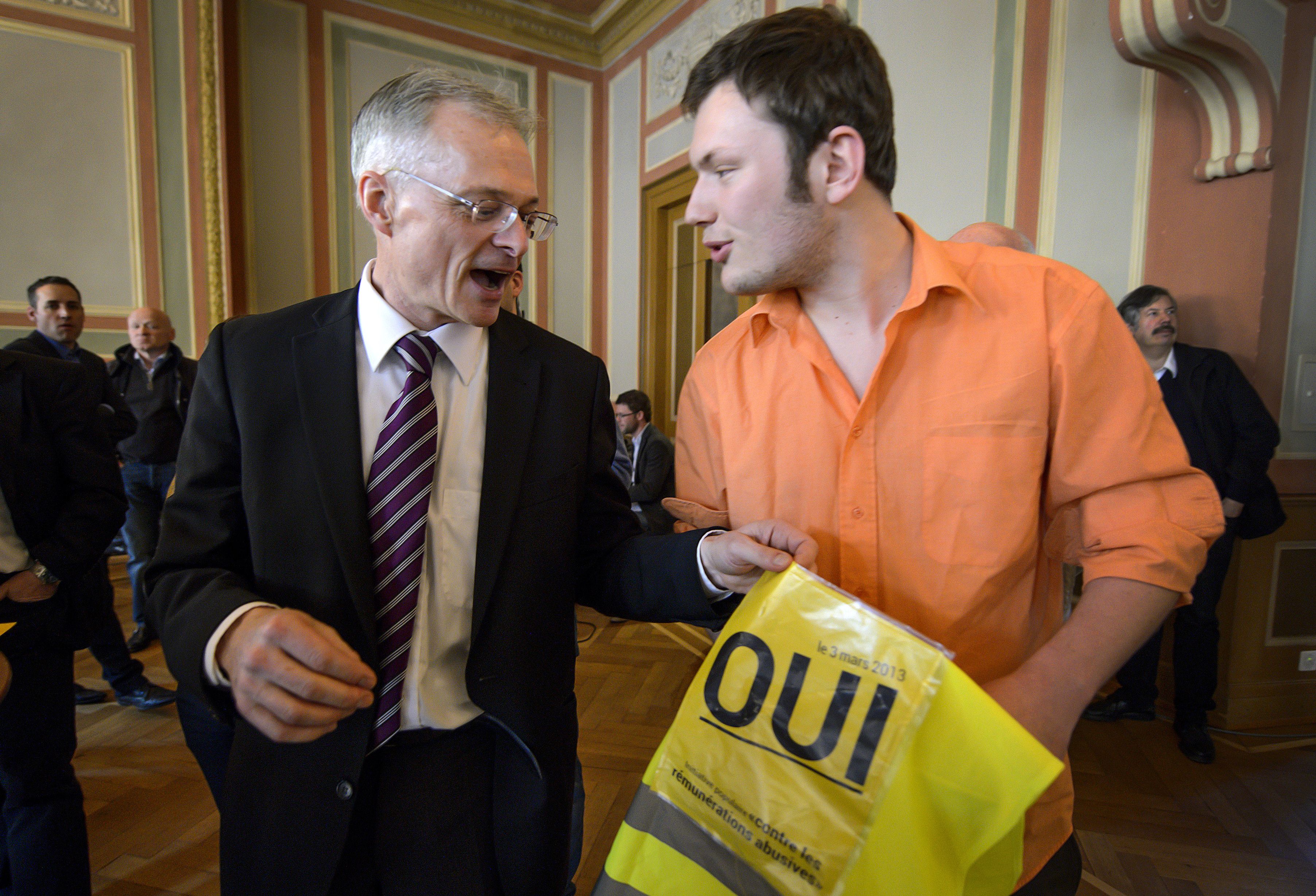 Thomas Minder (à esq.), proponente da medida agora aprovada em referendo FABRICE COFFRINI/AFPportugal copia tantas coisas do norte da europa, vamos ver se esta também cola sobre ordenados "pornográficos" dos gestores PÚBLICOS / bancos em muitos casos com passivos de milhões."O povo suíço enviou um forte sinal aos conselhos de administração”, tinha dito Thomas Minder, proponente desta medida, quando ainda só havia projecções que indicavam que o "sim" iria ganhar esta votação.Casos recentes terão tido influência na decisão dos eleitores. O último é o do presidente cessante do conselho de administração da farmacêutica Novartis, Daniel Vasella, para o qual está prevista uma indemnização de “saída” de 72 milhões de francos suíços (cerca de 60 milhões de euros). Também os problemas financeirosdo banco USB, que perdeu milhares de milhões de euros entre 2008 e 2011, tanto com activos tóxicos como com negócios fraudulentos, enfureceram os suíços. O banco acabou por ser salvo com dinheiro público.